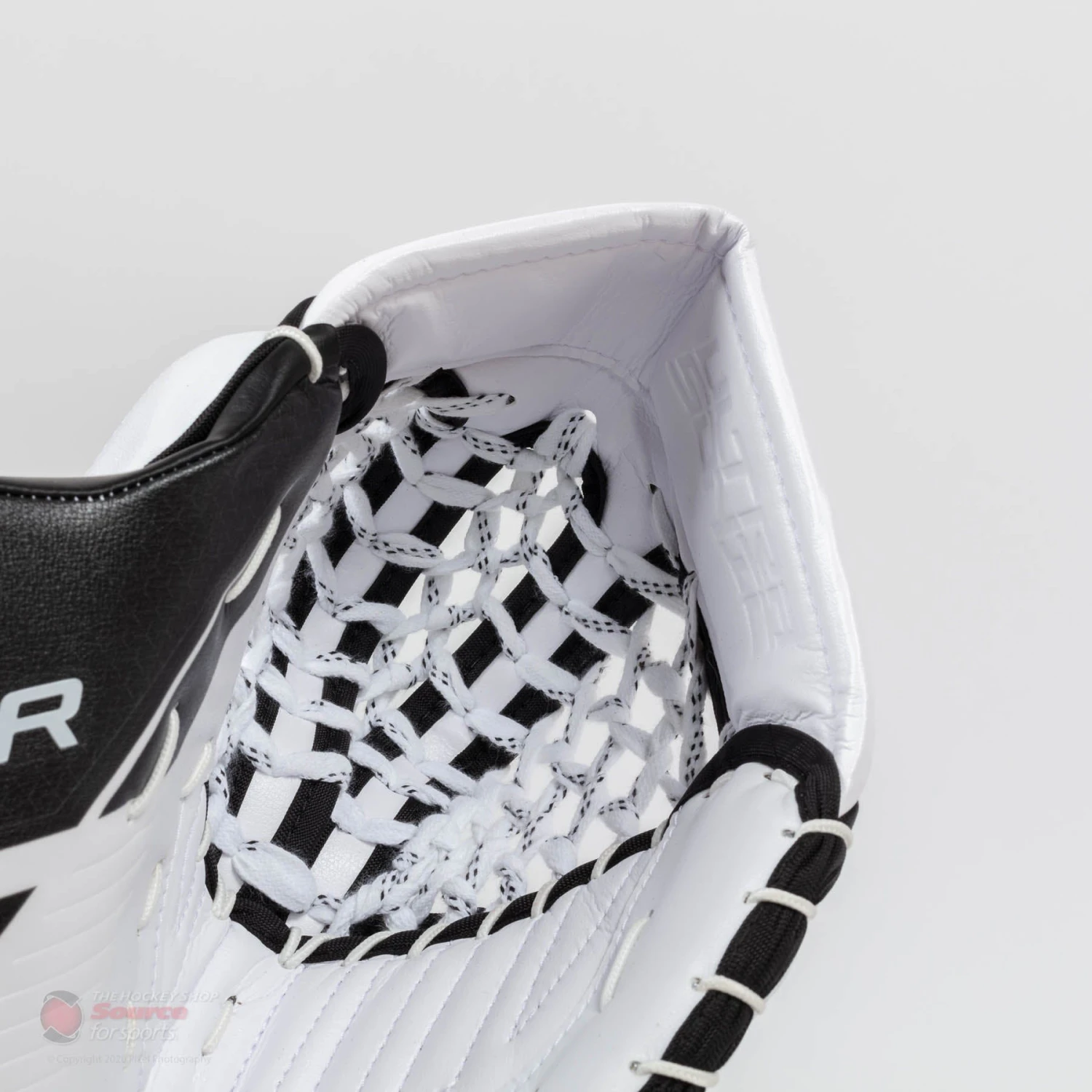 The Bauer Ultrasonic goalie catcher is a one piece made with Bauer’s CURV Composite to reinforce the cuff. Taking inspiration from the 2S Pro, the Ultrasonic is a very familiar shape and design. The backcover of the cuff also has full coverage protection. Poron XRD has also been added to key areas of the trapper’s cuff to improve protection and reduce the pain of stingers.