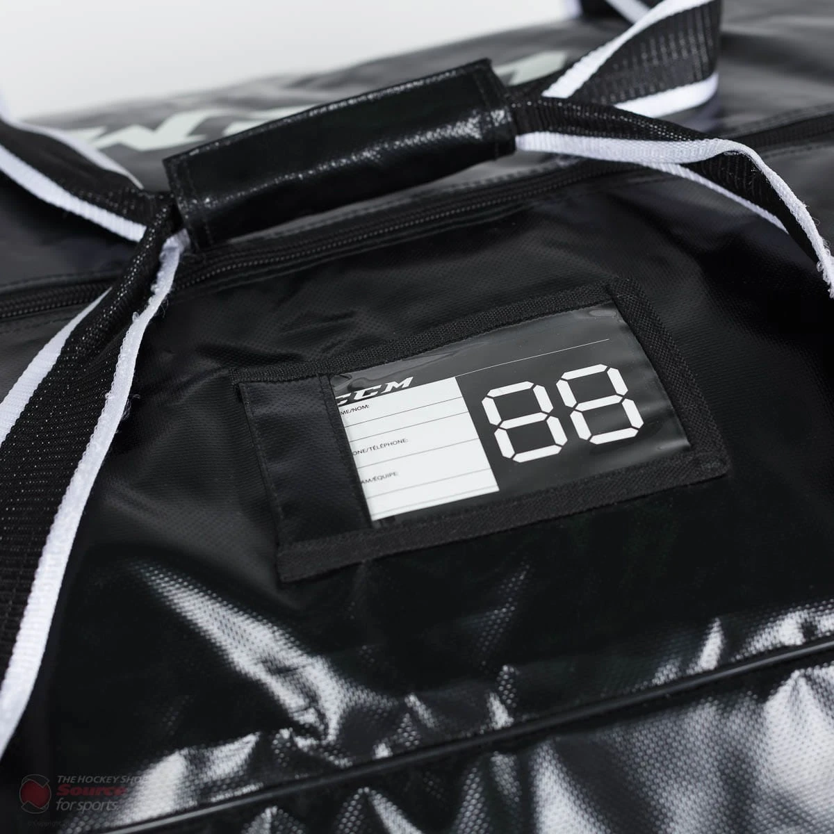 The pro carry goal bag from CCM is made with heavy duty water-resistant tarpaulin to provide long-term durability against wear and tear. The side panels have been left blank with large openings?the perfect place for teams to customize their bags with screened logos. At each end is a reinforced webbed handle in addition to centralized main carry straps. The pro carry goal bag also includes air grommets to allow air flow-through to promote freshness, as well as an internal zippered mesh accessory pocket and player ID pocket.