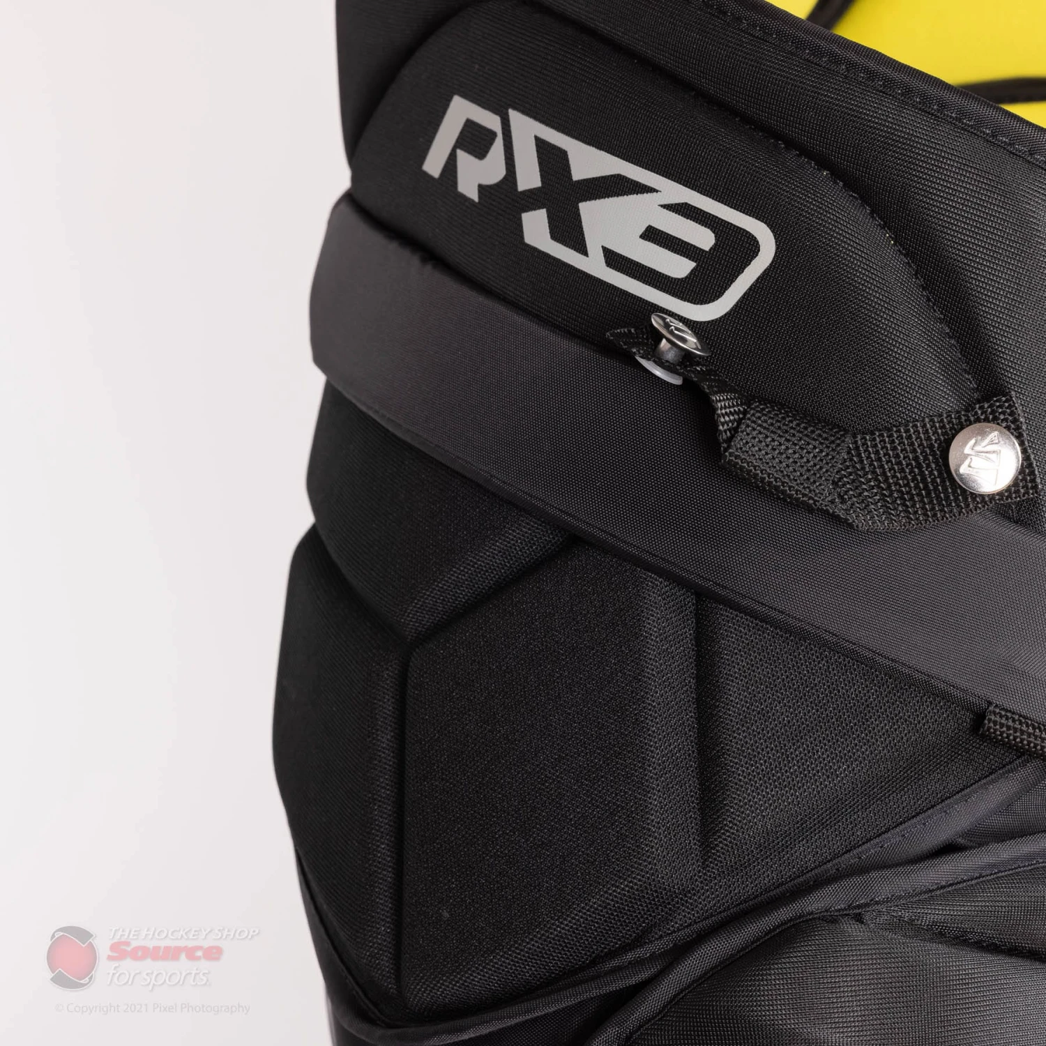 The Warrior Ritual X3 E+ INT Goalie Pants has new redesigned kidney and hip protection. The Warrior X3 E+ goal pants feature HyperComp in the FlexPlates to improve the durability and protection in those areas. The Ritual X3 E+ pants have added AxyCut Design which maximizes the thigh protection, as well as reinforced high wear areas on the pants.